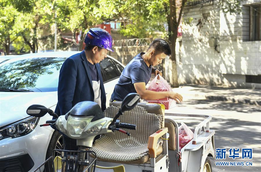 9月20日,新疆伊寧市實大實點心店老板馬川(右)在幫顧客將買好的月餅裝車。新華社記者馬鍇攝