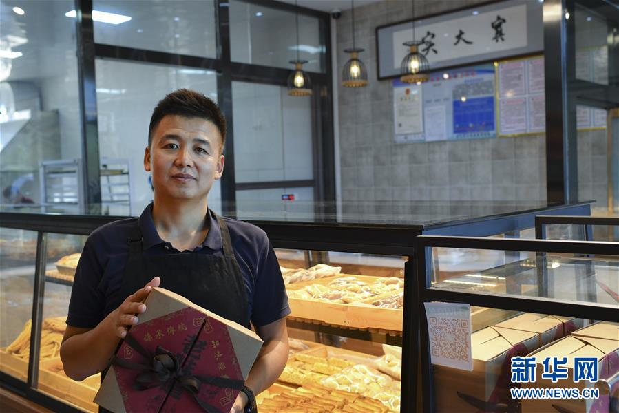 9月19日,新疆伊寧市實大實點心店老板馬川在店里展示包裝好的月餅。新華社記者王菲攝
