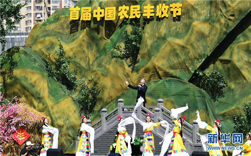 這是9月23日在北京舉行的首屆中國農(nóng)民豐收節(jié)主場活動上拍攝的農(nóng)民文藝表演。 新華社記者 殷剛/攝