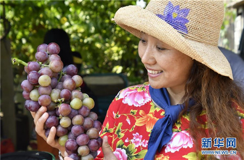 8月26日,游客在北京大興區(qū)采育鎮(zhèn)一個葡萄園內(nèi)展示剛采摘的葡萄。新華社記者 李欣/攝