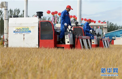 9月23日,在首屆中國農(nóng)民豐收節(jié)黑龍江慶安分會場舉行的開鐮儀式上,當(dāng)?shù)剞r(nóng)民參加開鐮大賽。新華社記者 王凱/攝