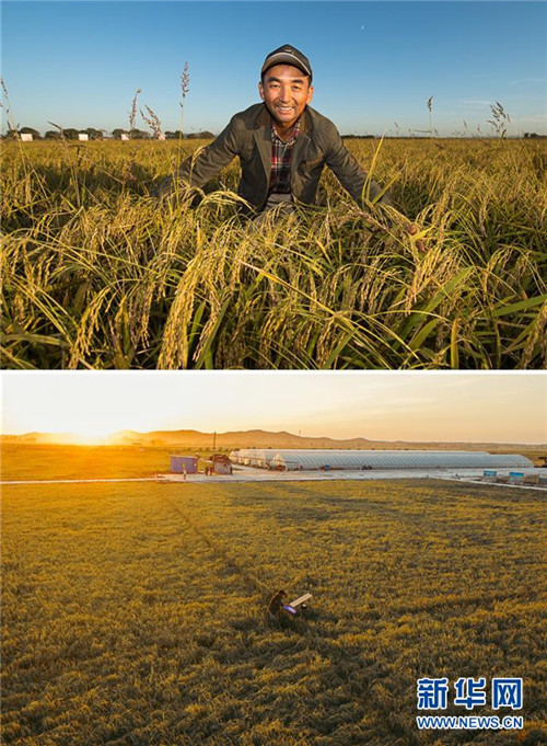 拼版照片:上圖為9月18日,在吉林省舒蘭市平安鎮(zhèn)金星村,有機(jī)水稻種植戶李學(xué)明站在稻田里;下圖為9月18日,李學(xué)明在清理稻田間設(shè)置的太陽能物理滅蟲器(無人機(jī)拍攝)。新華社記者 許暢/攝