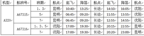 昆明-長(zhǎng)治-沈陽(yáng)航線航班號(hào)為A67315/A67316,每周一、三、五、七執(zhí)飛,具體航班時(shí)刻如下: