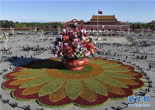 9月23日在北京天安門廣場拍攝的“祝福祖國” 巨型花籃。 新華社記者 李賀/攝