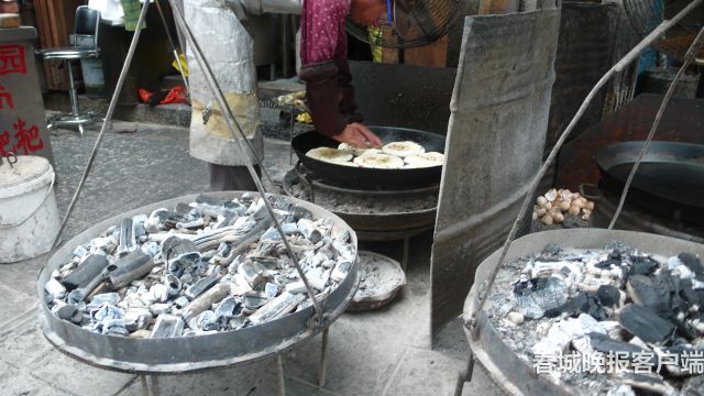 喜洲粑粑的烹制過程也很獨(dú)特,爐底爐蓋兩層栗碳火,中間有鍋。頭晚上發(fā)好的面,第二天揉捏加工成一個個的圓餅,放到鍋里烘烤。甜餅的餡包在圓餅中心,咸餅的肉餡和蔥花直接揉在面里,加雞蛋的直接攤在餅面上。在鍋里烘烤的時間,全憑烹制者的經(jīng)驗。一鍋可放7至8個喜洲粑粑,平均10分鐘左右可烤出一爐。