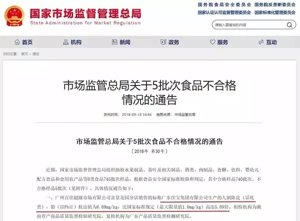 而兩個(gè)月以前,這款九制陳皮才被查出鉛超標(biāo)7倍。當(dāng)時(shí)的抽檢通報(bào)顯示,福州沃爾瑪百貨有限公司銷售的,標(biāo)稱“廣東佳寶集團(tuán)有限公司生產(chǎn)”的九制陳皮(話化類),鉛檢出值為8.00mg/kg,比國家標(biāo)準(zhǔn)規(guī)定高出7.0倍。