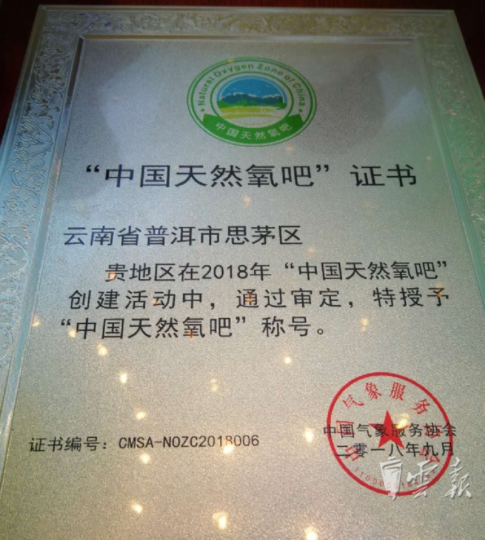 9月26日, 2018年“中國天然氧吧”創(chuàng)建活動發(fā)布會在北京舉行,普洱市思茅區(qū)獲此殊榮。