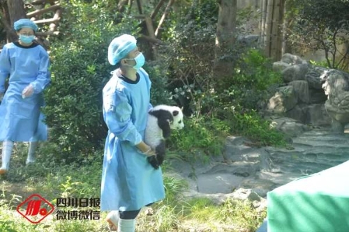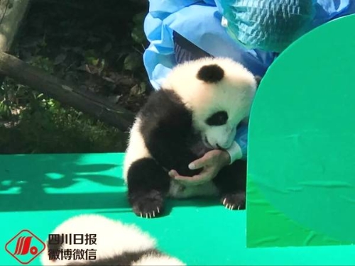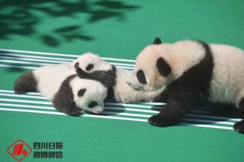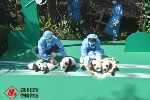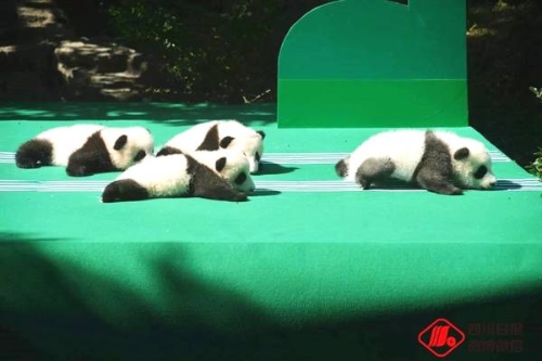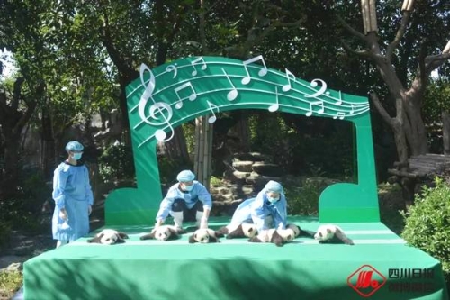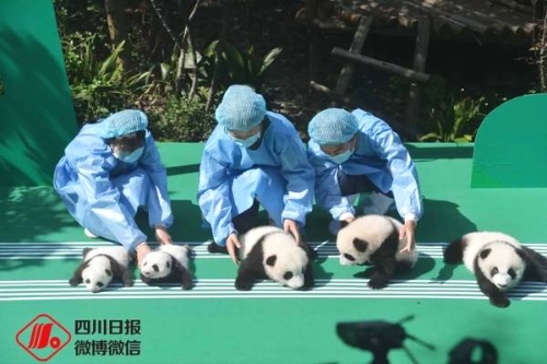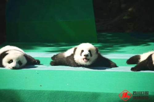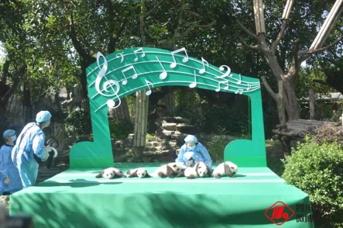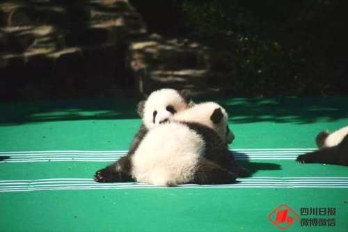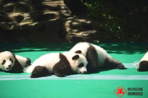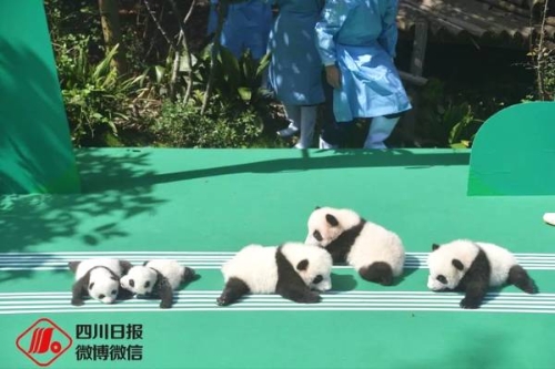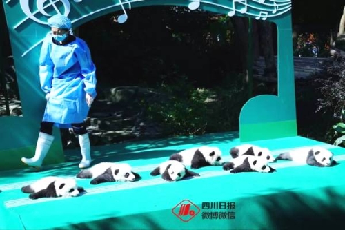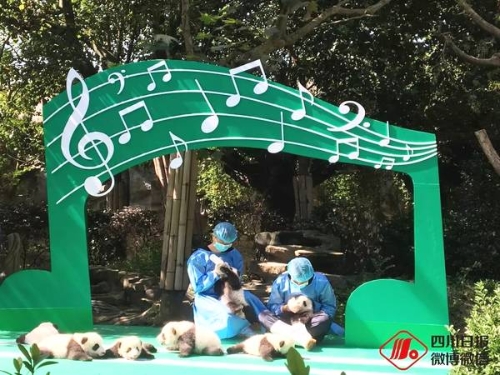 上午10 點30分左右,在成都熊貓基地太陽產(chǎn)房活動場,由7只新生大熊貓寶寶組成的“太陽天團”依次被飼養(yǎng)員抱出場外,7只可愛的大熊貓寶寶有序的趴在畫有五線譜的地毯上,黑白相間的大熊貓寶寶好似一個個音符!