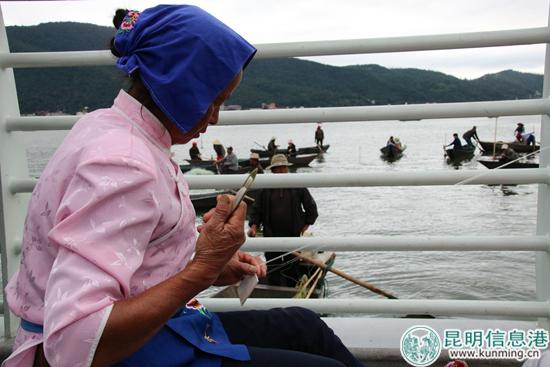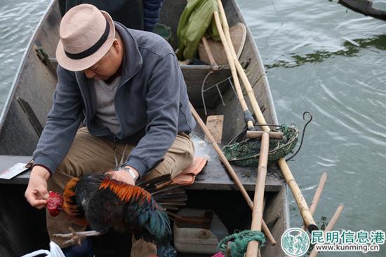 漁民口中念念有詞,祈禱完畢后又抱著大公雞跪拜數(shù)次,在船上宰雞灑血“避邪”后,漁民們開始劃著船由岸邊向水中央駛?cè)?。古法祭船作為此次“民俗共享會”的重頭戲,既是傳統(tǒng)的滇池漁家民俗,也是福海悠久漁業(yè)文化、市井文化和民俗文化的體現(xiàn)。