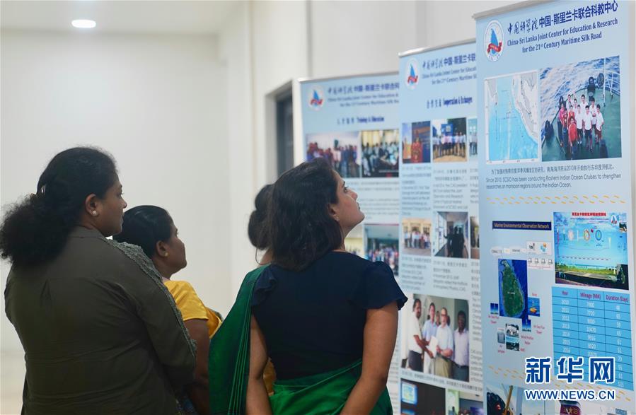 9月27日,在斯里蘭卡南部城市馬特勒的盧胡納大學(xué),學(xué)校師生在海洋科技綜合試驗(yàn)觀測(cè)平臺(tái)綜合樓內(nèi)觀看展板。 新華社記者唐璐攝