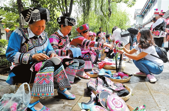 近日,“指尖上的藝術 心靈上的花朵”彝繡動態(tài)展在楚雄市彝人古鎮(zhèn)茶花溪開展。來自楚雄彝族自治州各地的60余名繡娘穿戴漂亮的彝族服飾,現場表演刺繡技法。游客不僅可以近距離觀看繡娘們的針法技藝,還可現場參與,體驗彝繡的魅力。(云南日報 記者李秋明)