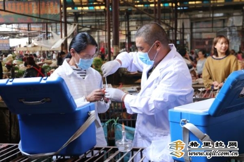 疾控中心工作人員在農貿市場活禽交易點進行現場采樣檢測。近日,維西縣疾控中心組織專業(yè)人員對全縣進行H7N9禽流感外環(huán)境采樣監(jiān)測。采樣人員嚴格按照禽流感監(jiān)測規(guī)程操作流程,針對活禽市場、養(yǎng)殖場等禽類密集區(qū)域進行采樣監(jiān)測。同時還耐心向活禽交易攤主及養(yǎng)殖戶詳細講解了人感染H7N9禽流感防治的相關知識。
