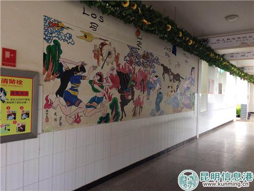 記者一走入民族小學校園,最先映入眼簾的是整個校園主體建筑上的墻體彩繪,這些彩繪完全采用濃濃民族特色的顏色和圖案,有少數民族生產、生活、娛樂、慶典等活動,有各種各樣的服飾圖案,有勞動工具、器樂用品等。