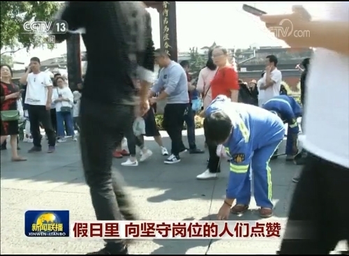 有人為國家建設(shè)添磚加瓦,有人堅守一線,保障他人喜樂平安。這兩天,南京夫子廟景區(qū)人流如織,游客看的是風(fēng)景,而保潔員劉啟法的眼中只有垃圾雜物,就連石板縫里的也都一點點勾出來。到了該吃午飯的時候,劉啟法沒時間去休息室,就在角落里席地而坐。