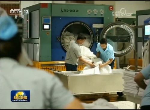 晚上11點,哈爾濱鐵路客運(yùn)段洗滌車間一片忙碌,張艷霞和同事們連夜在清洗火車床單、枕套。國慶節(jié)期間,旅客猛增,他們的工作量也比平時增加了一倍,一晚上分揀、洗滌、烘干消毒,走個不停。