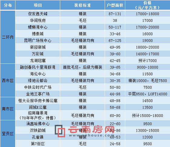 昆明公寓項目(不完全統(tǒng)計,具體銷售信息以售樓部釋放的為準,此處為參考)