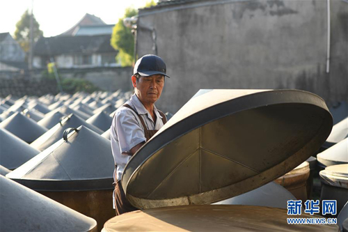 10月7日,安昌古鎮(zhèn)一家傳統(tǒng)醬園的工作人員在曬醬。