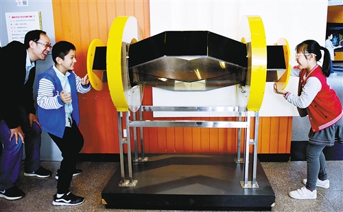10月7日,小朋友和家長(zhǎng)在鄭州科技館里體驗(yàn)“翻轉(zhuǎn)的鏡像”?!笆弧奔倨?許多小朋友走進(jìn)鄭州科技館,體驗(yàn)形式多樣的科普活動(dòng),學(xué)習(xí)科普知識(shí)。新華社記者朱祥/攝