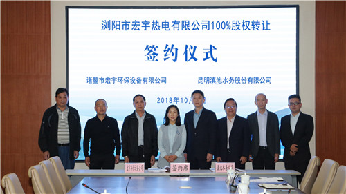 昆明信息港訊 記者趙鵬 10月8日下午,昆明滇池水務(wù)股份有限公司與諸暨市宏宇環(huán)保設(shè)備有限公司在滇池湖畔舉行股權(quán)轉(zhuǎn)讓簽約儀式。按照合同約定,滇池水務(wù)將投資4140.26萬(wàn)元人民幣,收購(gòu)瀏陽(yáng)市宏宇熱電有限公司100%股權(quán)。