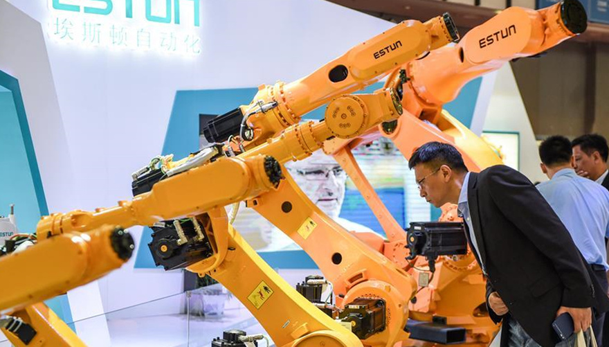 觀眾們在博覽會上參觀展出的智能自動化機器人。新華社 記者李博/攝