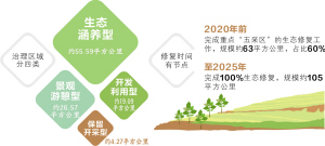 規(guī)劃所稱的“五采區(qū)”,不僅包含了傳統(tǒng)意義上的“砂、石、土、磚、礦”五種類型,同時也將“疑似采區(qū)”(偷挖盜采點)和因喀斯特地貌導(dǎo)致的石漠化植被裸露區(qū)納入本次規(guī)劃的范疇,為便于稱謂,統(tǒng)稱為“五采區(qū)”,規(guī)模約105平方公里。規(guī)劃期限為2017年至2025年,其中近期為2020年。要求近期在2020年前完成重點“五采區(qū)”的生態(tài)修復(fù)工作,規(guī)模約63平方公里,占比60%。至規(guī)劃期末2025年完成100%生態(tài)修復(fù),規(guī)模約105平方公里。