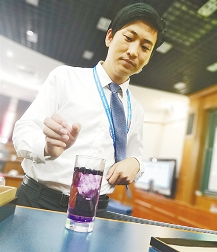 比賽現(xiàn)場(chǎng),黃俊科拿出一個(gè)杯子,倒入礦泉水,放入幾粒黑枸杞,僅用了兩秒鐘,黑枸杞開始釋放出紫色,很快就把這杯水染成了漂亮的透明紫色。記者嘗了一下,還有一股淡淡的甜味。