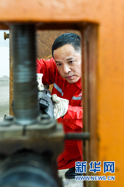 在中國石化江蘇油田工程技術(shù)服務(wù)中心,田明在檢查設(shè)備(10月9日攝)。新華社記者 李博 攝