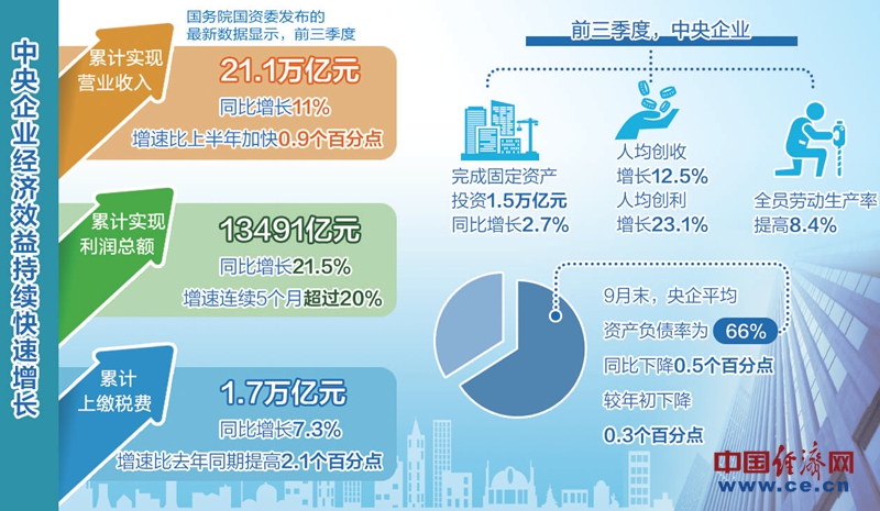 “三增”為央企營業(yè)收入增、效益增、稅費(fèi)貢獻(xiàn)增。前三季度,央企累計(jì)實(shí)現(xiàn)營業(yè)收入21.1萬億元,同比增長11%,增速比上半年加快0.9個(gè)百分點(diǎn),收入增速已連續(xù)4個(gè)月超過10%;累計(jì)實(shí)現(xiàn)利潤總額13491億元,同比增長21.5%,增速連續(xù)5個(gè)月超過20%;累計(jì)上繳稅費(fèi)1.7萬億元,同比增長7.3%,增速比去年同期提高2.1個(gè)百分點(diǎn)?!耙唤怠睘樨?fù)債率下降,9月末,央企平均資產(chǎn)負(fù)債率為66%,同比下降0.5個(gè)百分點(diǎn),較年初下降0.3個(gè)百分點(diǎn)。