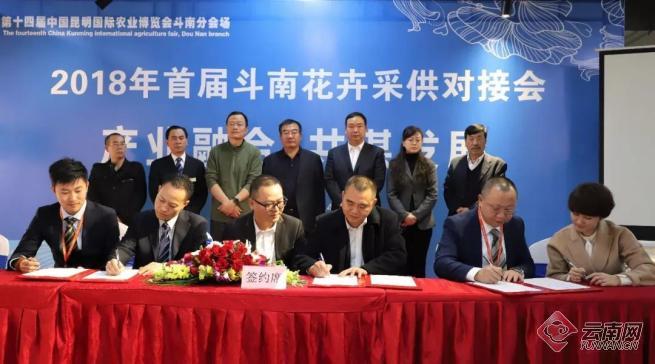當(dāng)天,昆明斗南花卉云科技有限公司副總經(jīng)理李健、電商事業(yè)部經(jīng)理王浩驥、運(yùn)營推廣部經(jīng)理賴乾頊代表科技公司,與園區(qū)內(nèi)23家企業(yè)簽訂斗南花卉采供戰(zhàn)略合作協(xié)會(huì)。
