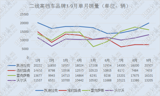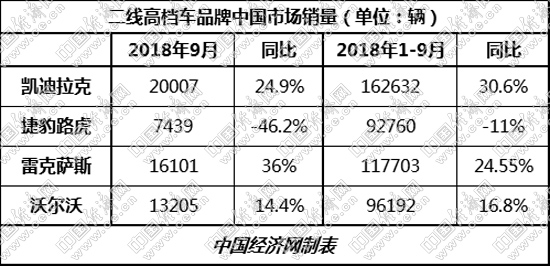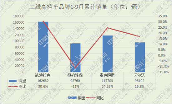 從前9月累計(jì)銷量來(lái)看,二線高檔車市場(chǎng)依然保持兩極分化態(tài)勢(shì)。穩(wěn)固榜眼之位的雷克薩斯與凱迪拉克繼續(xù)位居第一陣營(yíng);而銷量仍不見(jiàn)起色的捷豹路虎則被沃爾沃超越,排名由第三位滑落至二線高檔末尾。