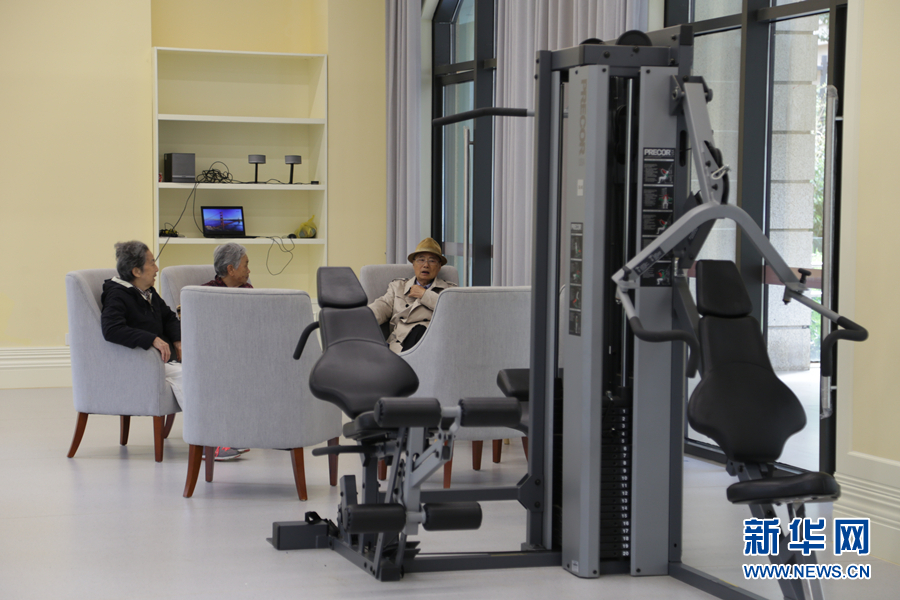 幾位老人在養(yǎng)老活力小鎮(zhèn)內(nèi)的健身中心休息。