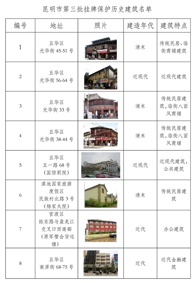 昆明信息港訊 實(shí)習(xí)記者刁鳳云 近日,昆明市政府下發(fā)《關(guān)于第三批掛牌保護(hù)歷史建筑名單的批復(fù)》,同意將國(guó)防劇院、五華區(qū)光華街45-51號(hào)等8處建筑列為昆明市第三批掛牌保護(hù)歷史建筑。