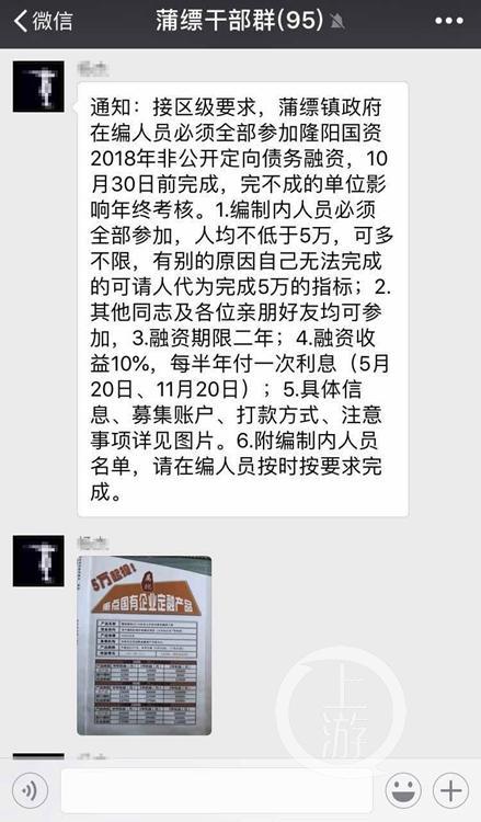 據上游新聞報道 10月19日,云南知名大V@煙云在微博上發(fā)布了名為“浦縹干部群”的微信對話截圖顯示,稱云南保山隆陽區(qū)發(fā)布通知,要求編內人員必須全部參與隆陽國資2018年非公開定向債務融資,10月30日前完不成任務單位將影響年終考核。