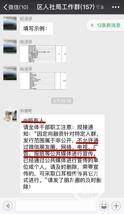 保山隆陽區(qū)人社局工作群里要求不得對外傳播定向融資的情況。
