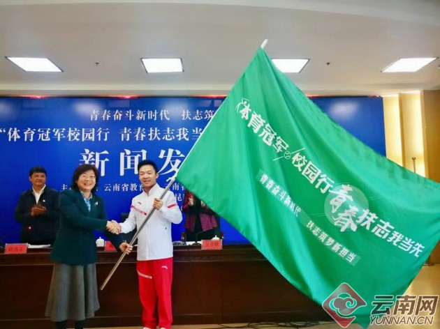 10月19日,“體育冠軍校園行 青春扶志我當(dāng)先”體育公益扶志活動新聞發(fā)布會在昆明海埂訓(xùn)練基地召開。云南省委高校工委副書記、省教育廳黨組成員陶晴為體育冠軍宣講團(tuán)授旗,宣講團(tuán)成員、云南省體操協(xié)會副主席、2012年倫敦奧運(yùn)會體操男團(tuán)冠軍郭偉陽代表宣講團(tuán)接旗。