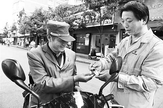“師傅你好,送你一個便攜式煙灰缸,麻煩以后煙頭不要亂丟!”桃源街上,保潔班長劉勤邦向正在抽煙的電動車駕駛人發(fā)放便攜式煙灰缸。劉勤邦向記者介紹,桃源廣場一帶每天都會產生很多垃圾,對于環(huán)衛(wèi)工人而言,最頭疼的就是煙頭?!皝G在路中間縫隙的,我們只能自己摳。”劉勤邦邊蹲下身撿煙頭邊說,希望大家能為環(huán)衛(wèi)工人考慮一下,自覺維護環(huán)境衛(wèi)生。