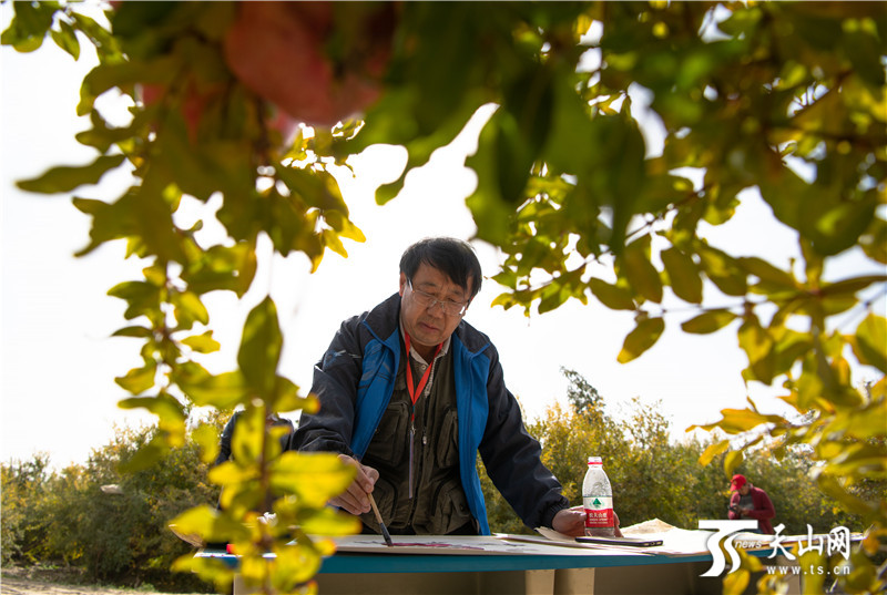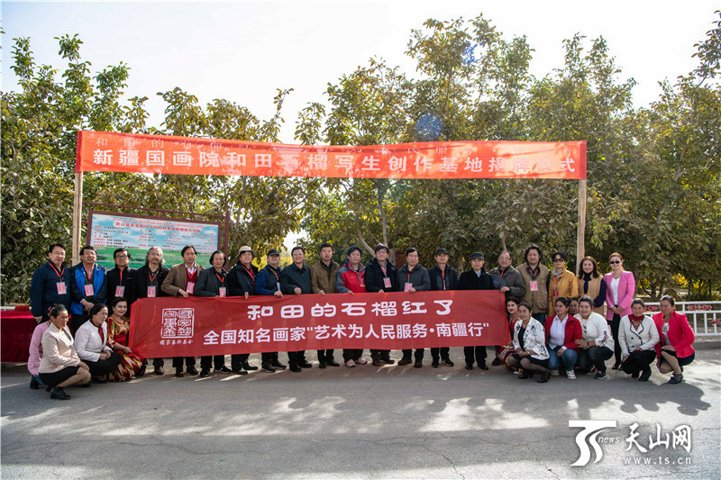 當(dāng)日,國(guó)家藝術(shù)基金資助項(xiàng)目、新疆經(jīng)濟(jì)報(bào)社指導(dǎo)支持、新疆國(guó)畫院主辦的和田的石榴紅了——全國(guó)知名畫家“藝術(shù)為人民服務(wù)·南疆行”系列活動(dòng)采風(fēng)團(tuán)一行十五人,與當(dāng)?shù)馗刹咳罕娨黄饋淼叫陆吞锏貐^(qū)皮山縣皮亞勒瑪鄉(xiāng)蘭干庫(kù)勒村石榴科技示范園,對(duì)皮亞曼石榴進(jìn)行寫生、創(chuàng)作。