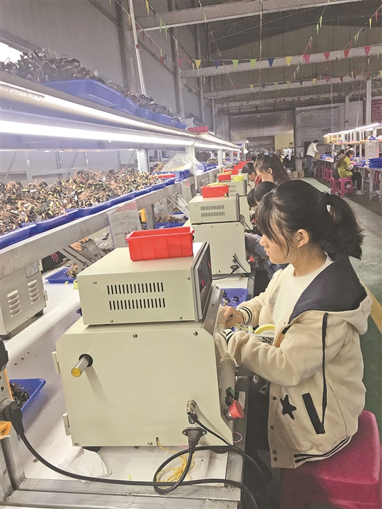 亞博電子廠車間內(nèi),工人們正在生產(chǎn)線上緊張工作。建檔立卡貧困戶李參飛嫻熟地焊接著電子元器件。今年1月,他正式搬遷到富村鎮(zhèn)圓夢佳園小區(qū),也結(jié)束了在東莞的打工生活,在家附近的亞博電子廠實現(xiàn)就業(yè),月工資3000多元。李參飛對如今的生活很是滿意:“在家門口就能打工,還方便照顧孩子,心里踏實多了?!?/p>