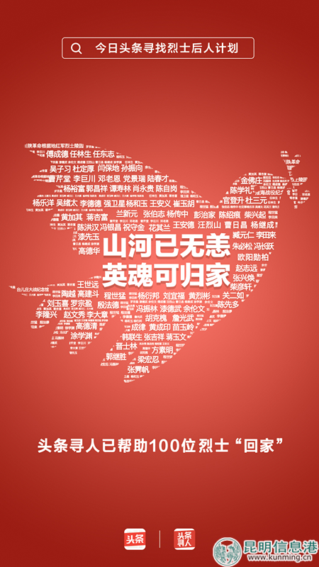 昆明信息港訊 記者勞學(xué)麗 10月24日,今日頭條旗下公益尋人平臺“頭條尋人”表示,截至目前,“頭條尋人”已成功幫助100位英雄烈士找到后人。第100個成功案例是在淮海戰(zhàn)役犧牲的山西武鄉(xiāng)籍革命烈士關(guān)二如。據(jù)介紹,“頭條尋人”在云南地區(qū)已成功尋回35位走失者,幫助35個云南家庭團(tuán)圓。但在“尋找革命烈士后人”方面目前在云南地區(qū)還未有成功案例,該項目也希望能與烈士陵園或相關(guān)公益組織進(jìn)行合作,幫助更多烈士“回家”。