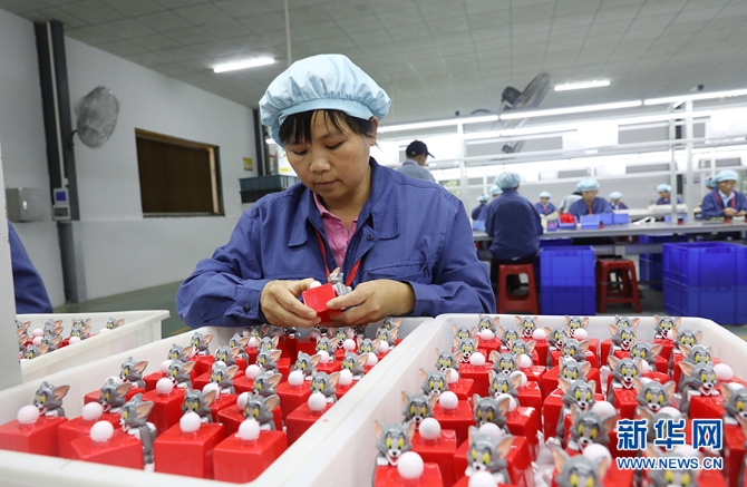 英德市連江口鎮(zhèn)連樟村扶貧工廠的工人在檢查玩具產(chǎn)品的質(zhì)量。2017年村里通過產(chǎn)業(yè)扶貧引入企業(yè)落戶到村,讓村民實現(xiàn)了家門口就業(yè)(10月24日攝)。新華社記者王瑞平攝