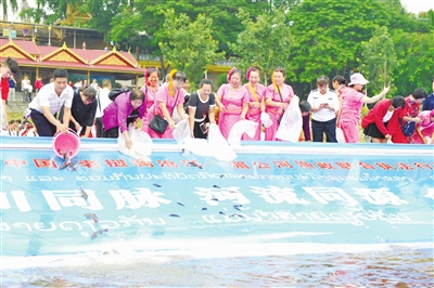 農(nóng)業(yè)農(nóng)村部長(zhǎng)江流域漁政監(jiān)督管理辦公室副主任董金和,云南省農(nóng)業(yè)農(nóng)村廳副廳長(zhǎng)張穆,老撾人民民主共和國(guó)自然資源與環(huán)保部辦公廳主任坎盼·南塔翁參加活動(dòng)。(西雙版納報(bào) 記者丹洛 羅桂華 何茜茜)