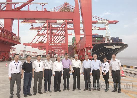 交通運輸部老領導黃鎮(zhèn)東(左五)、王展意(左四)、林祖乙(右五)、劉松金(右四)、洪善祥(左三)、胡希捷(左二)、楊利民(右三)日前參加部離退休部長黨支部活動,考察上海港洋山港區(qū)四期碼頭。 特約記者黃京麗/攝
