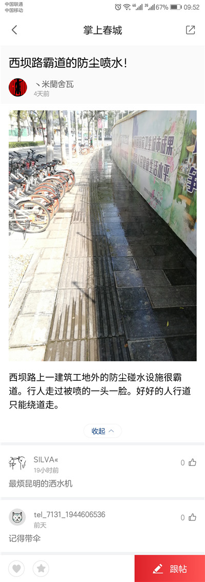 “西壩路上一建筑工地外的防塵噴水設(shè)施很霸道。行人走過被噴的一頭一臉,好好的人行道只能繞道走?!苯?有市民來到掌上春城“問吧”欄目發(fā)帖留言,講述了自己路過西壩路附近時,被建筑工地外墻頂?shù)膰娝O(shè)施弄得一頭一臉的煩心事。