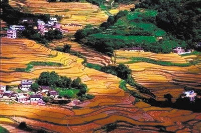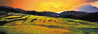 層層疊疊的梯田,時(shí)有微風(fēng)拂過,沉甸甸的稻粒隨風(fēng)跳動(dòng),給人以無限生機(jī)的視覺享受。從遠(yuǎn)處望去,蜿蜒柔和的線條排列在一起,猶如大地的指紋,金燦燦的水稻鋪滿整個(gè)山坡,加上梯田間間或佇立的小屋,構(gòu)成一幅美麗醉人的田園風(fēng)光畫。