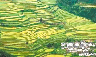 其中歐家梯田分東西兩坡,總面積1000多畝,規(guī)模宏大、氣勢(shì)磅礴,東坡梯田700多畝綿延近3公里,梯田沿山層疊,級(jí)數(shù)達(dá)2000多級(jí),梯田坡度在20度至75度之間;黑山梯田內(nèi)眾多山峰猶如布陣列隊(duì),極富特色,眾山包裹下的梯田,曲線優(yōu)美。秋收時(shí),飽滿的稻穗灑下遍地碎金……猶如一幅美麗絕倫的鄉(xiāng)村油畫。