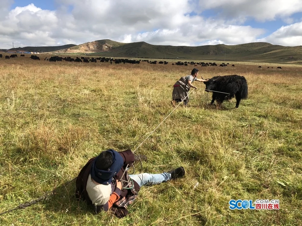 采訪團隊第一次和撲爾洼甲碰面是在若爾蓋縣城外的一片大草原上,當時的他恰巧在和牧民一起采取牛絨。在草原上騎著高大的駿馬,疾馳中套住瘋攢的牦牛,然后一個抱摔將一頭重量超過一噸的牦牛撂倒在地,三下五除二就采下了一大捧牛絨。