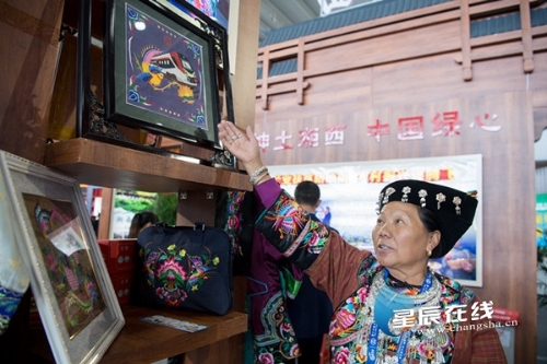位于長沙國際會展中心的湘西館里,記者見到了一位熟悉的朋友——湘西花垣縣十八洞村苗繡專業(yè)合作社負責人石順蓮。