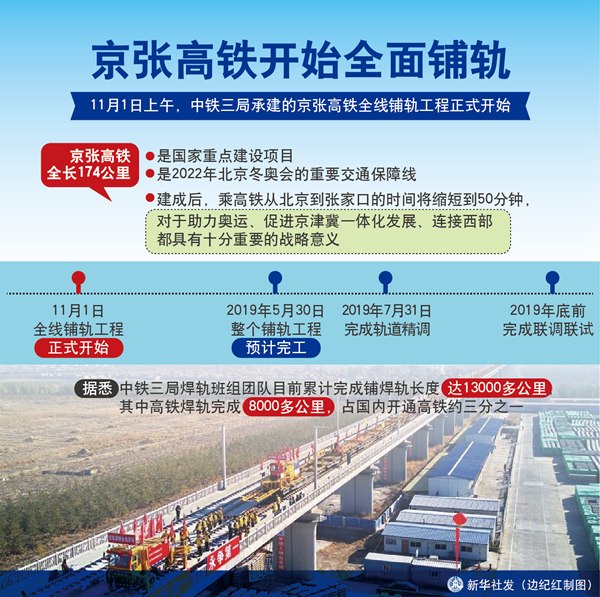 新華網(wǎng)北京11月1日電 記者韓家慧 記者從中國鐵路北京局集團有限公司獲悉,京張高鐵今日開始全線鋪軌,整個鋪軌工程預計2019年5月30日完工。建成后,乘高鐵從北京到張家口的旅行時間將縮短至1小時以內(nèi),這對助力冬奧會、促進京津冀協(xié)同發(fā)展都具有十分重要的意義。