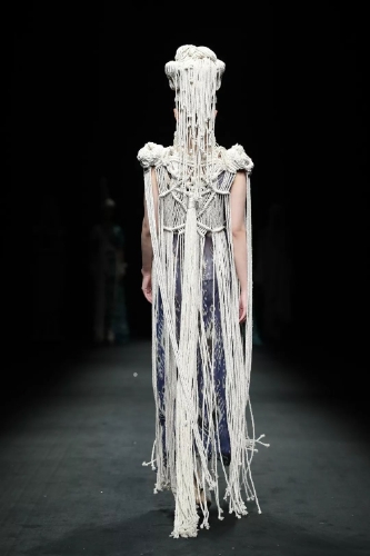 作為20年來一直潛心鉆研新疆服飾文化的中國十佳設(shè)計(jì)師陶陶,綜合西域人文特征和古絲綢之路的文化內(nèi)涵,寫意般的創(chuàng)作手法, 以“樓蘭夢”為發(fā)布主題,將新疆的三項(xiàng)國家級“非遺”巧妙地融入作品中,“艾德萊斯”“桑皮紙”“維吾爾刺繡”,一如既往地大面積使用純天然亞麻面料延續(xù)了以往的設(shè)計(jì)風(fēng)格,并運(yùn)用了手工編織的手法進(jìn)行再次創(chuàng)新,勾勒出大漠中的神奇色彩。