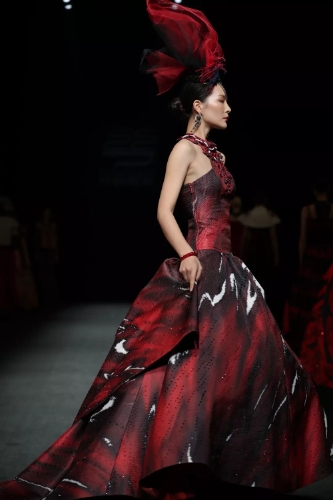 碰撞系列主要通過黑白紅三色的混搭,展示出典雅、國際、時(shí)尚的魅力。工藝采用刺繡、珠繡、盤繡等手工工藝完成。服裝在黑白紅的相撞中,折射出獨(dú)特的風(fēng)格和魅力,讓艾德萊斯在時(shí)尚的律動(dòng)中綻放光彩。